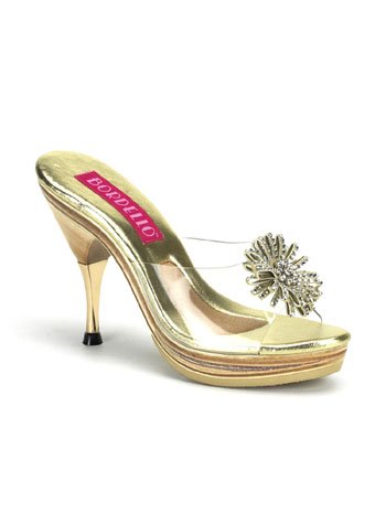 Clear upper sandal with rhinestone flower detail has wood clog bottom 1 inch platform and 4 1/2 inch metal tipped stiletto heel.
